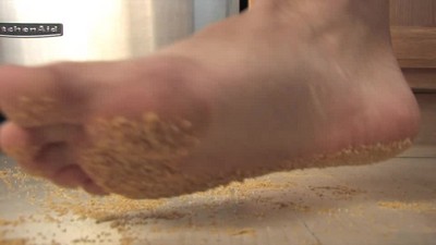 Master Dave prepares some crunchy treats for his slaves by trampling on cereal with his bare feet so they stick to his soles