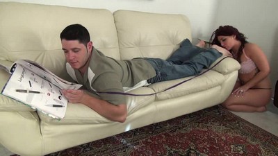 Master Ron is reading his newspaper and ignoring the slave girl who is licking his soles.